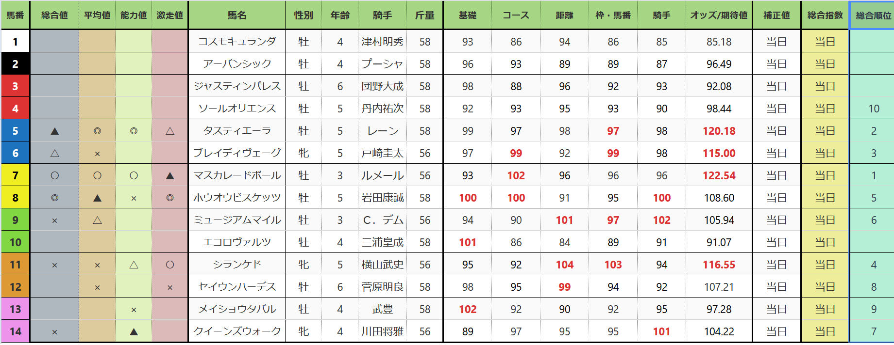 そこで、各指数と総合順位の見極めと、激走するであろう、